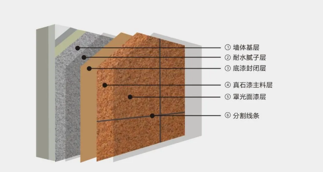 在墻面抹膩子找平后進(jìn)行真石漆施工,真石漆涂層主要由三部分組成:抗堿封底漆,真石漆中間層和罩面漆。